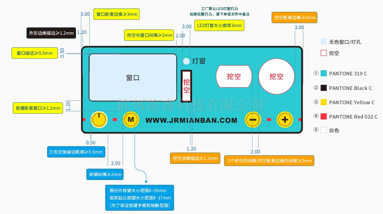 一般情況下窗口或挖空距離邊緣大于3mm,挖空、窗口、按鍵之間間距大于2mm,LED燈窗推薦大小為3mm,按鍵距離窗口大于1.2mm。
